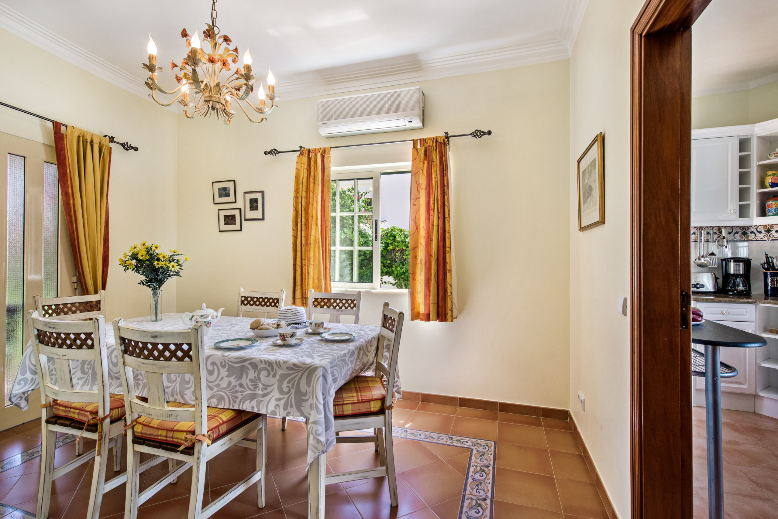 Sala de estar luminosa e acolhedora com Wi-Fi e TV (operador MEO – lista de canais aqui). Grandes portas de vidro abrem para um terraço coberto com área de refeições ao ar livre, perfeito para refeições ao fresco com vista para a piscina privada e o jardim.
